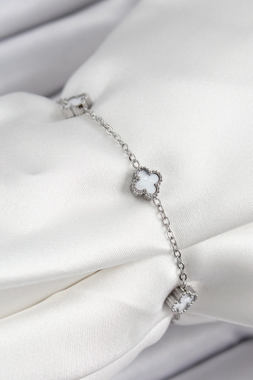316L Çelik Beyaz Sedef Yonca Model Gümüş Renk Kadın Bileklik