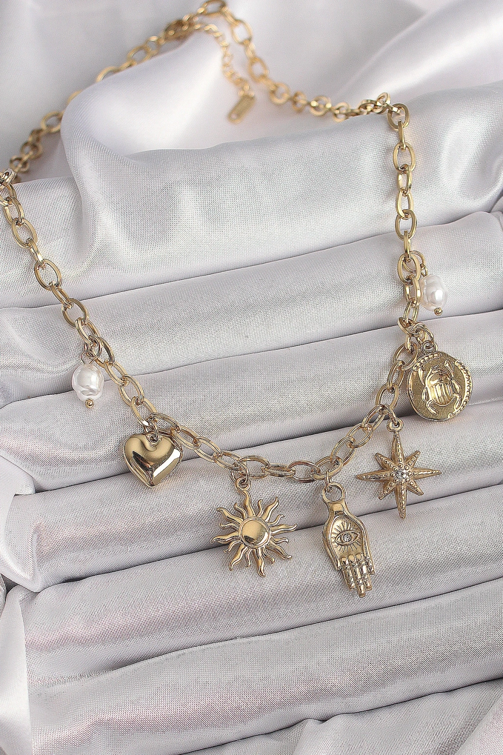 316L Çelik Gold Renk Halka Zincir Zirkon Taş Detaylı Fatma Ana El Figür Güneş Detay Kadın Kolye