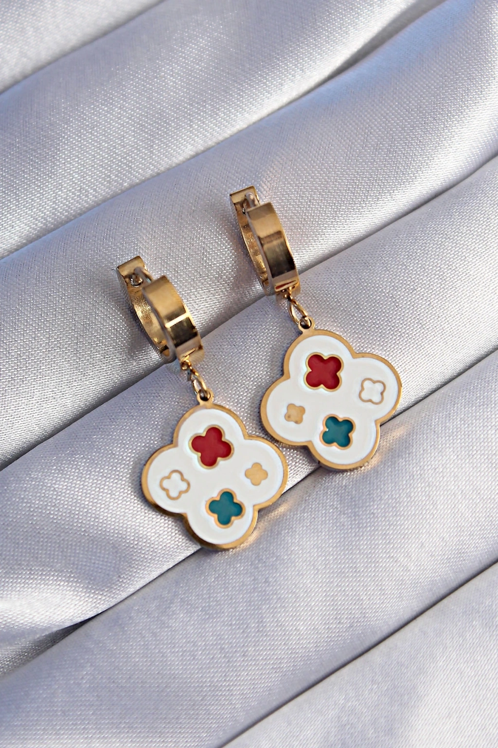 316L Çelik Gold Renk Renkli Mineli Yonca Küpe