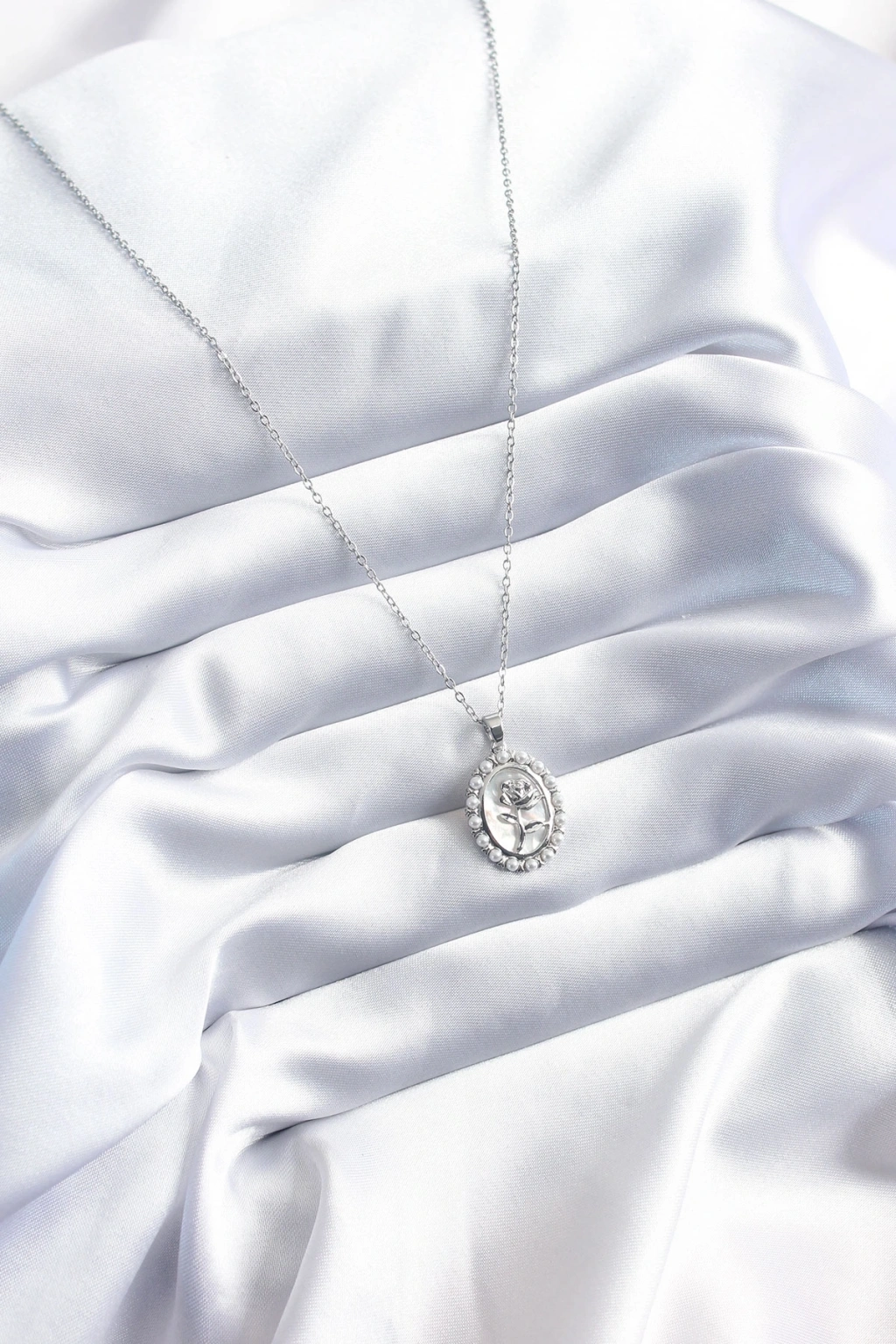 316L Çelik Gümüş Renk Gül Model İnci Detay Kadın Kolye