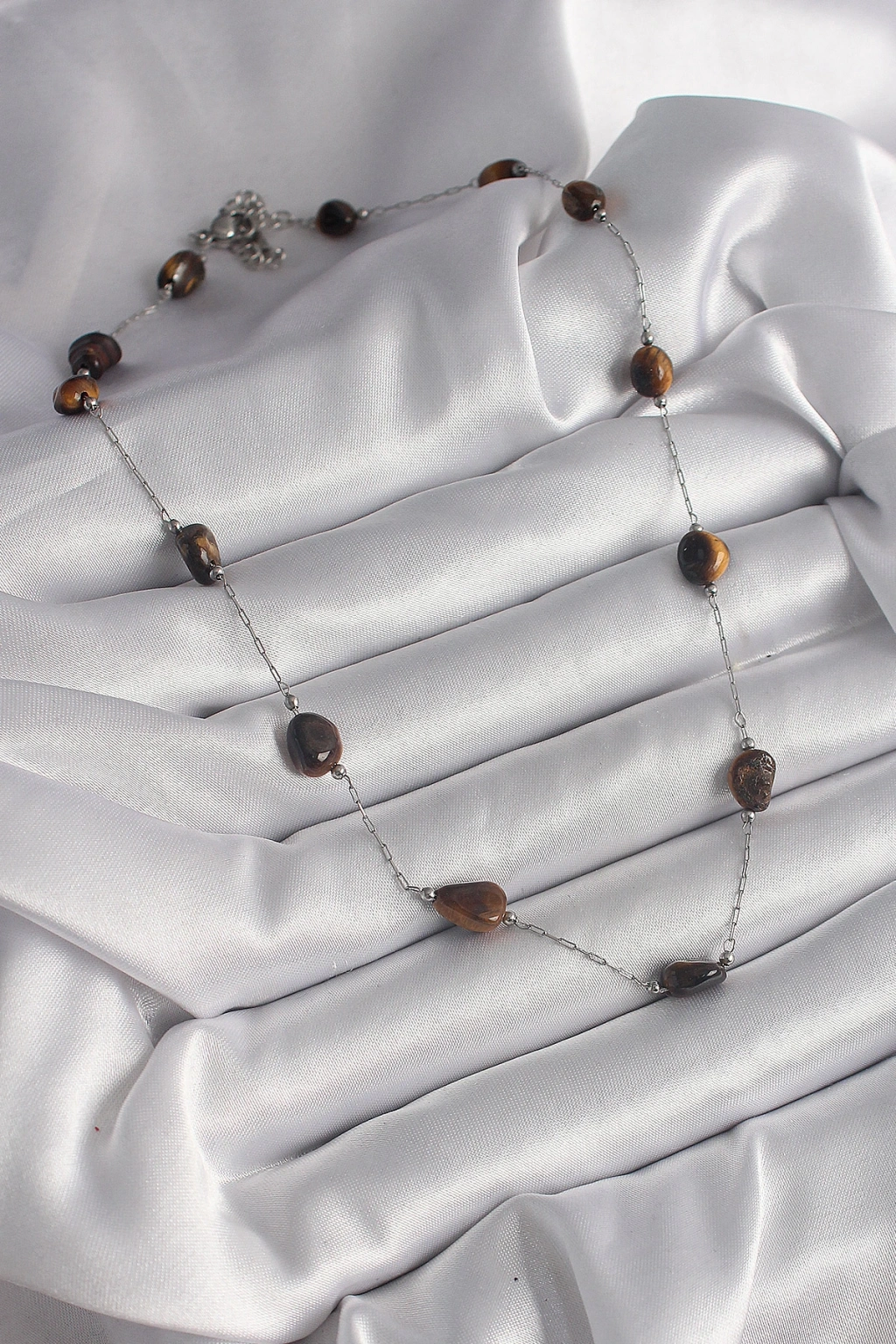 316L Çelik Gümüş Renk Zincir Kahverengi Doğaltaş Model Kadın Kolye