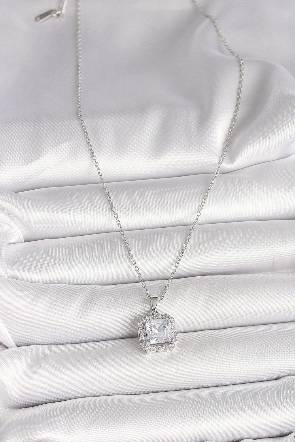 316L Çelik Gümüş Renk Zincir Kare Zirkon Taşlı Kadın Kolye