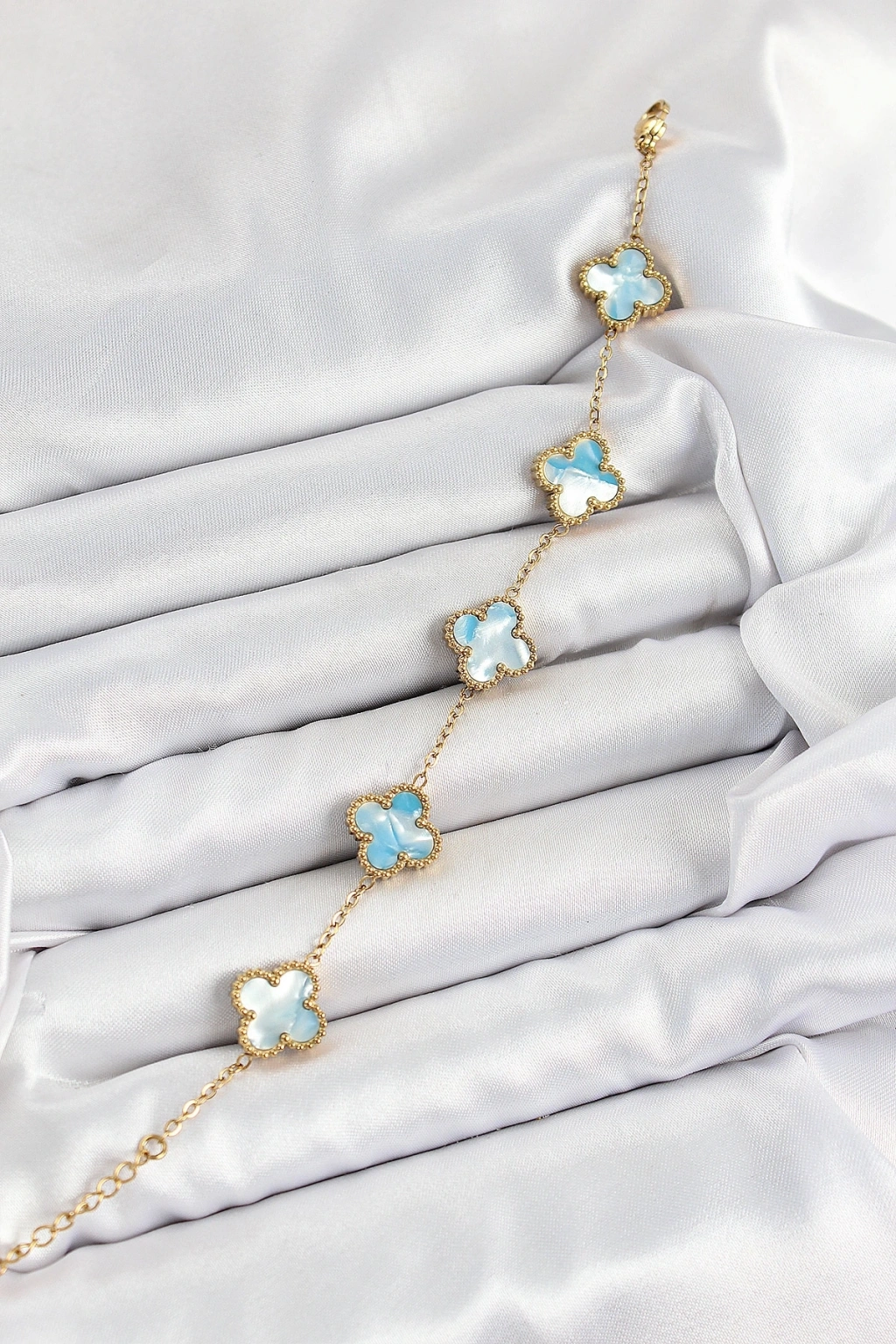 316L Çelik Mavi Sedef Yonca Model Gold Renk Kadın Bileklik