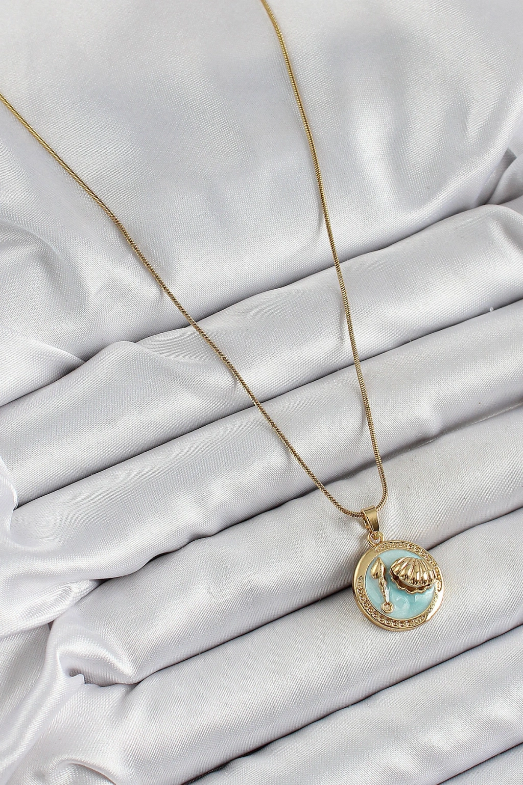 316L Çelik Zincir Turkuaz Mineli Sanatsal Portre İstiridye Model Gold Renk Kadın Kolye