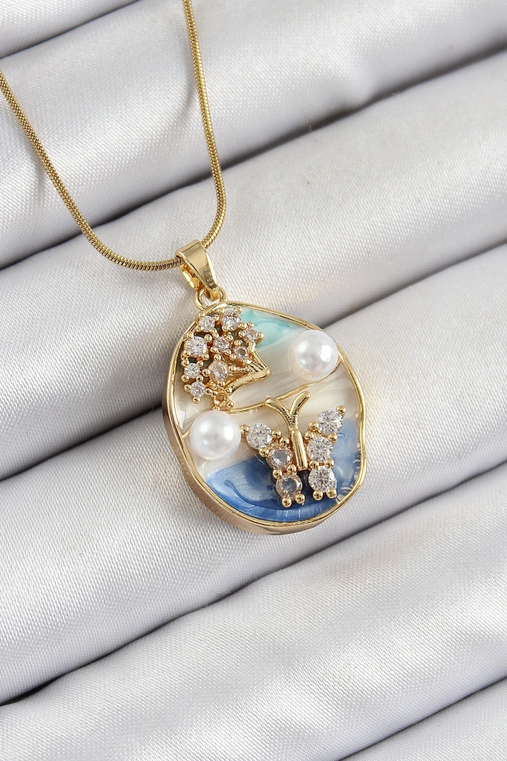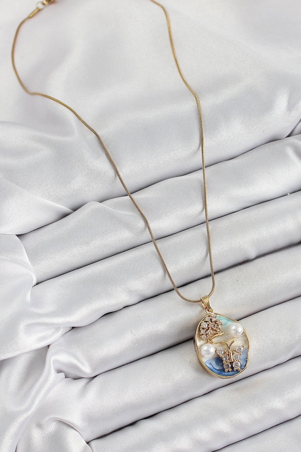 316L Çelik Zincir Zirkon Taşlı Mavi Beyaz Sanatsal Portre İnci Detaylı Ağaç Ve Kelebek Figürlü Model Gold Renk Kadın Kolye