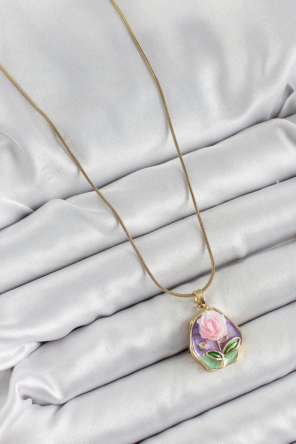 316L Çelik Zincir Zirkon Taşlı Pembe Ve Mor Sanatsal Portre Gül Figürlü Beşgen Model Gold Renk Kadın Kolye
