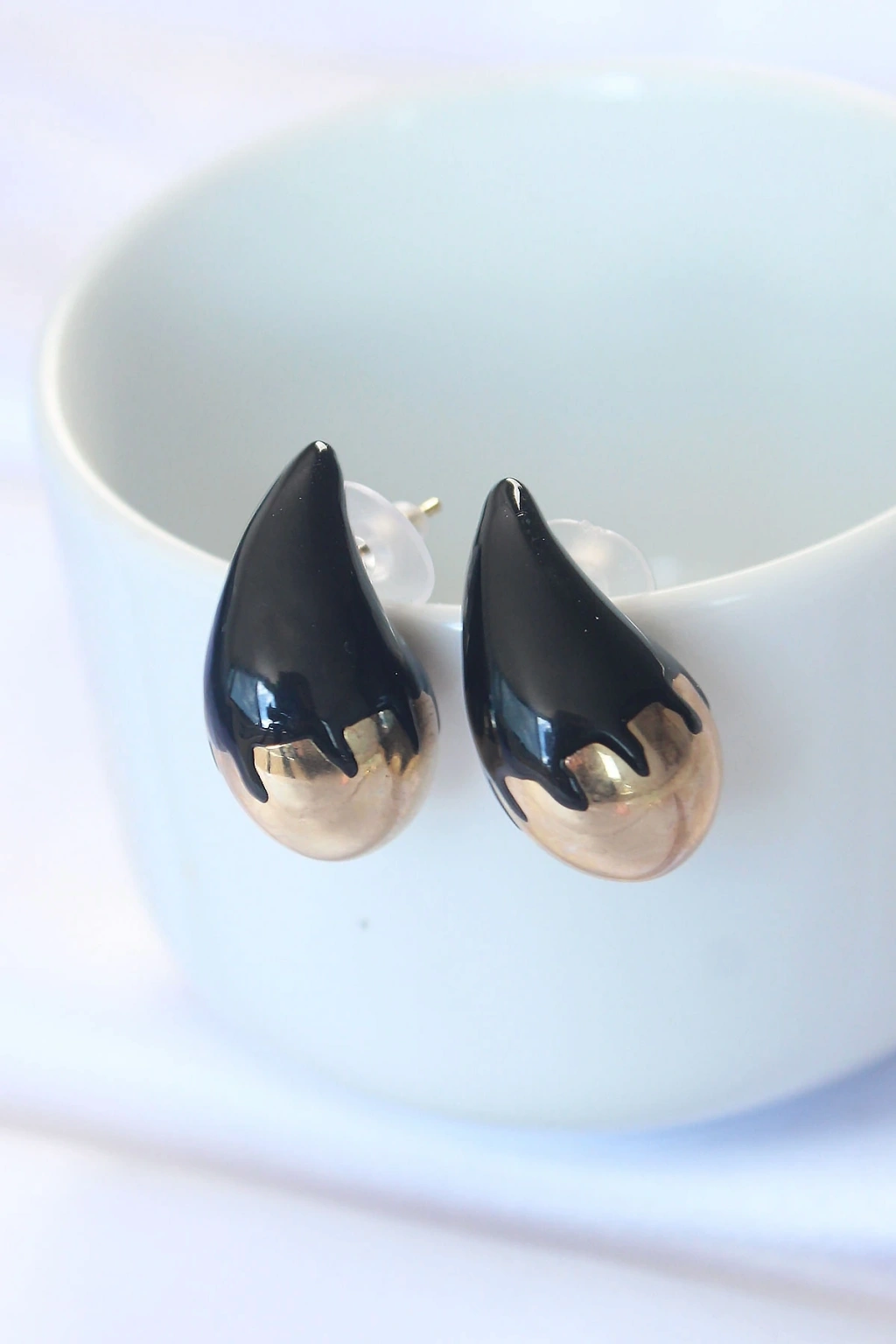 Minimal Siyah Mineli Çift Renk Damla Küpe