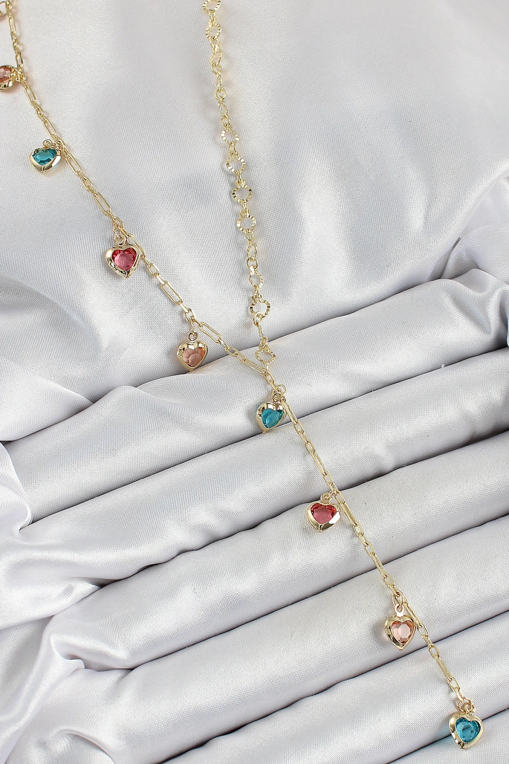Pirinç Asorti Kalp Model Gold Renk Zirkon Taşlı Y Kolye