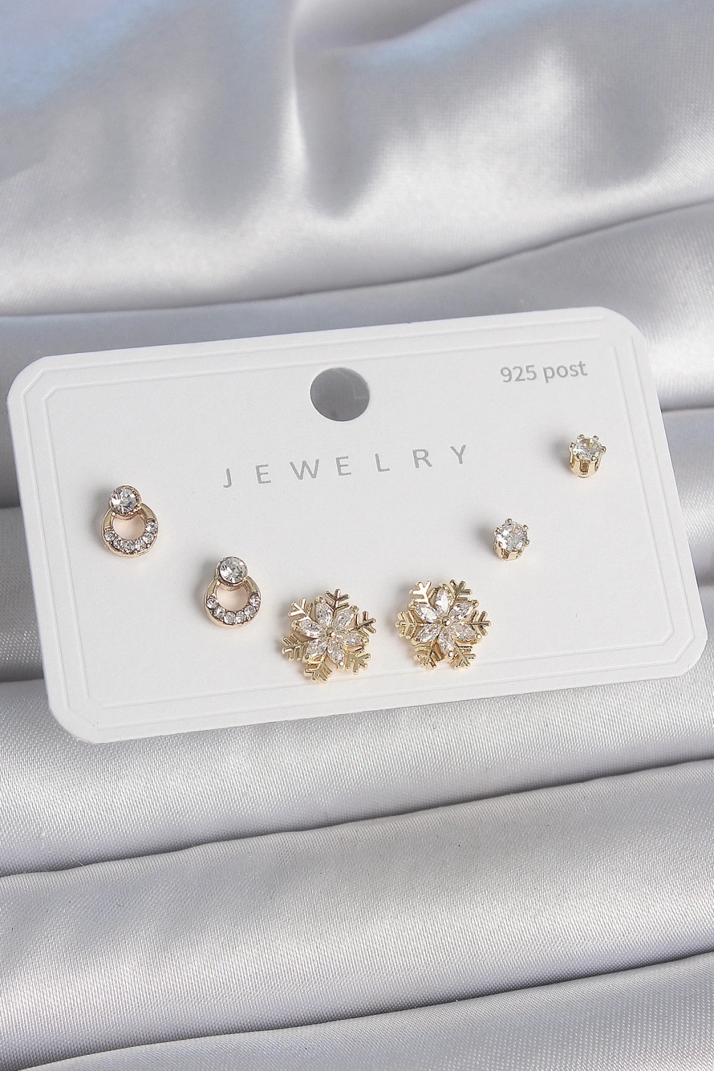 Pirinç Gold Renk Zirkon Taşlı Kar Tanesi Model 925 Ayar Gümüş Çivi Kadın Küpe Seti