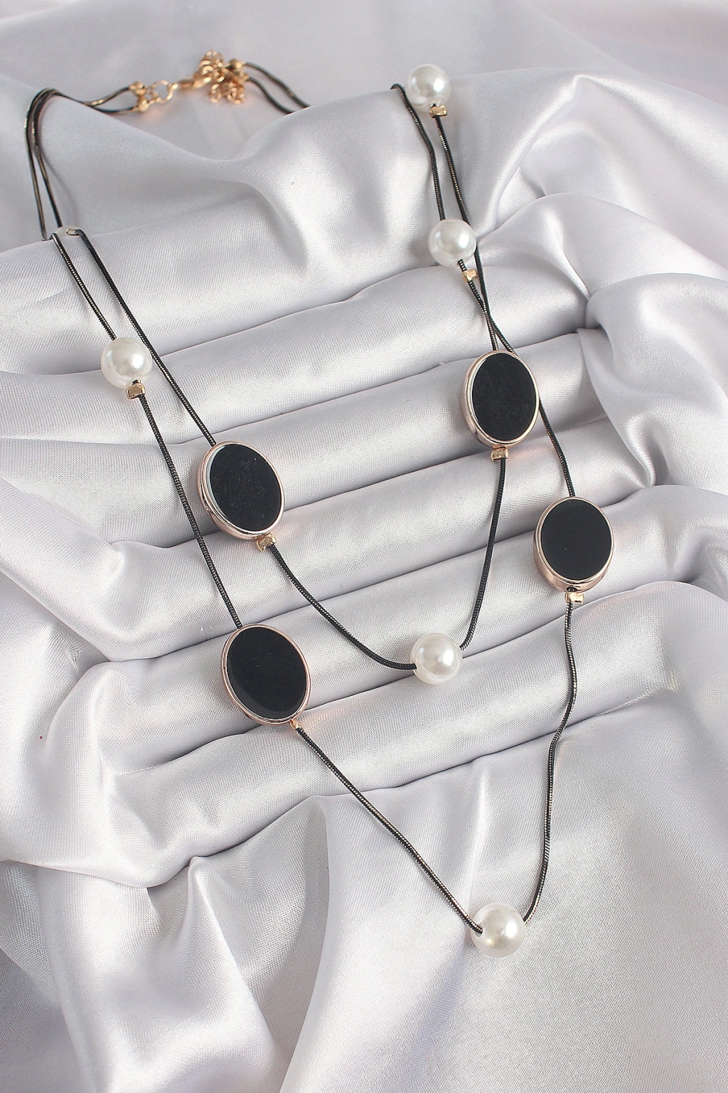 Pirinç Siyah Renk Zincir İnci Detaylı Çoklu Kadın Kolye
