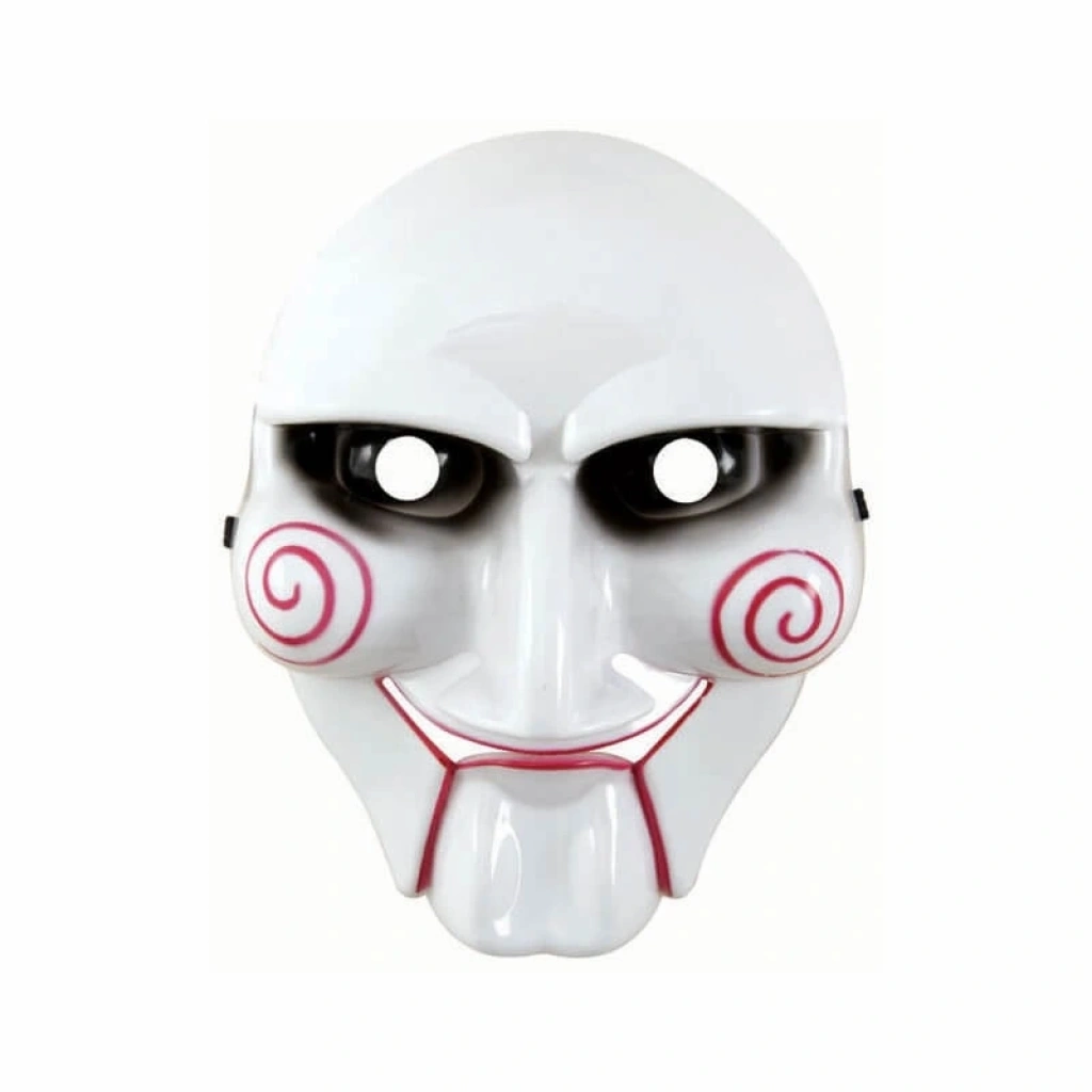 Yetişkinler ve Çocuklar için Parçalı maske siyah elastik sert plastik ve yapışması yapılmıştır. Siyah göz bölgesi, kırmızı ağız bölgesi ve yanaklarda kırmızı spirallerle beyazdır. Bu testere maskesi bir kukla kafasına benziyor, bir Cadılar Bayramı partisi için orijinal bir şekilde giyinmek için mükemmel .