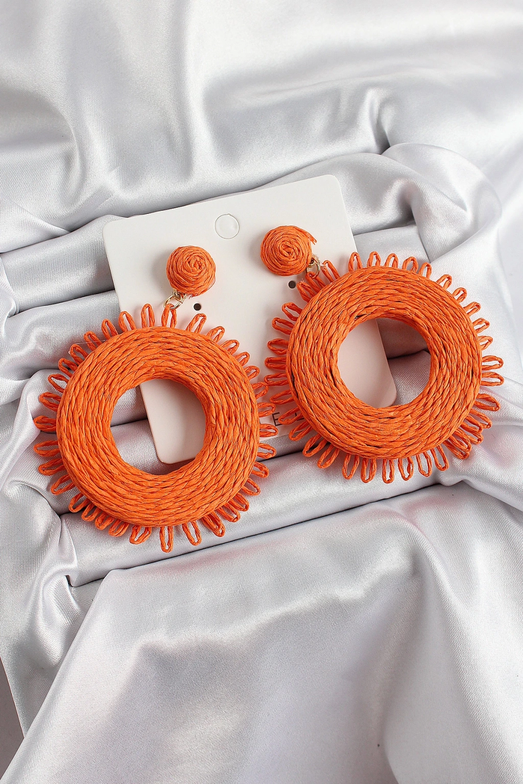 Turuncu Püsküllü Halka Figürlü Hasır Örgü Model Gold Renk Kadın Küpe