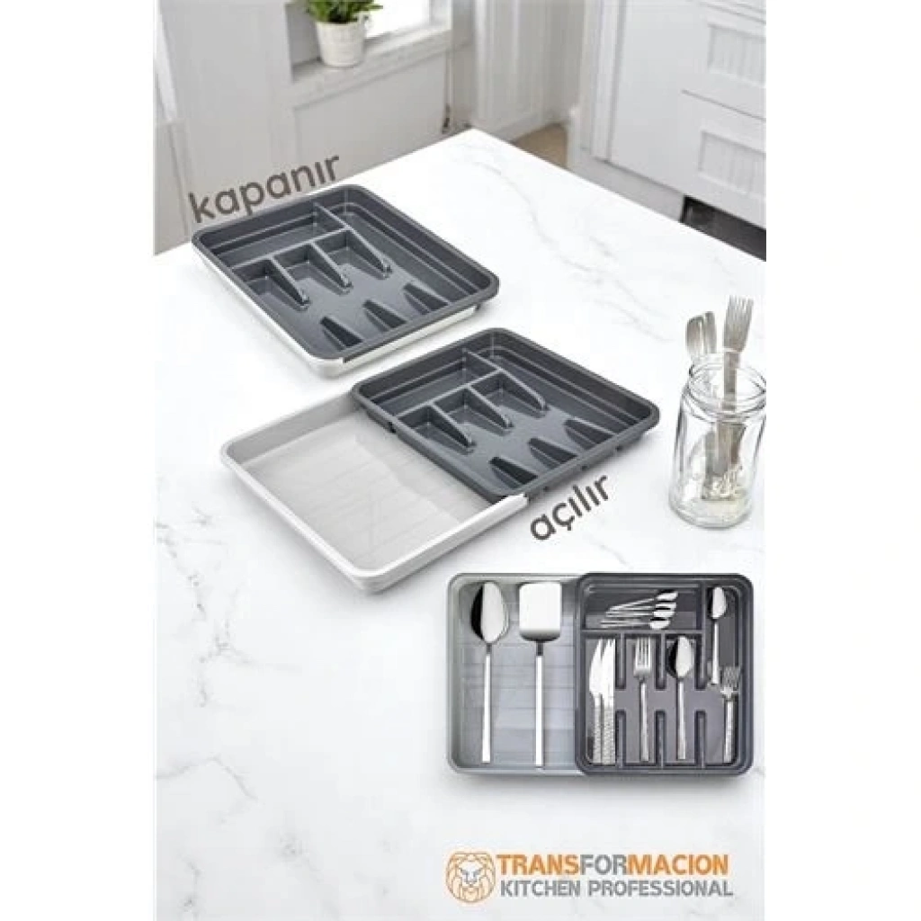Özellikler: Çift Durumlu Tasarım: Kapalı durumda: 29 cm genişlik x 33 cm uzunluk Açık durumda: 49 cm genişlik x 33 cm uzunluk Fonksiyonel Bölmeler: Kaşık, çatal, bıçak, spatula gibi mutfak gereçlerinizi düzenli bir şekilde yerleştirebileceğiniz ayrı bölmeler sunar. Esnek Kullanım: Farklı çekmece boyutlarına uyum sağlayarak mutfak düzeninizde maksimum verimlilik ve pratiklik sağlar. Kaliteli Malzeme: Sağlam ve uzun ömürlü yapısı sayesinde günlük kullanımda dayanıklılığını korur. Marka: Üzerinde “TRANSFORMACION KITCHEN PROFESSIONAL” etiketi bulunan ürün, profesyonel kaliteyi sofralarınıza getirir.